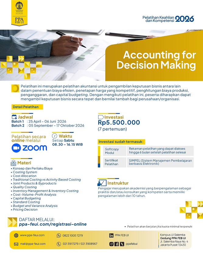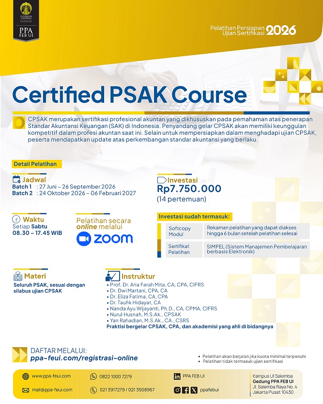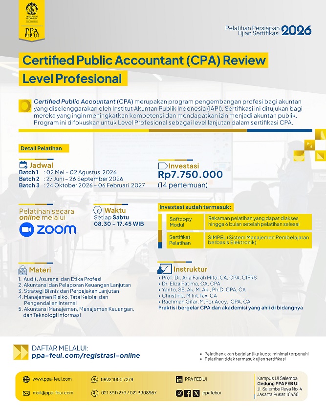 --------Terima kasih PPA FEB Ul untuk pelatihan CPMA Review-nya. Saya merasa terbantu sekali saat ujian CPMA kemarin. Materi yang diberikan selama kelas online sesuai dengan silabus ujian CPMA. lnstruktur-instruktumya berpengalaman dan sangat jelas dalam menyampaikan materi. Saya terbantu sekali terutama dalam diskusi soal kasus/essay.
