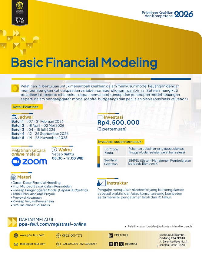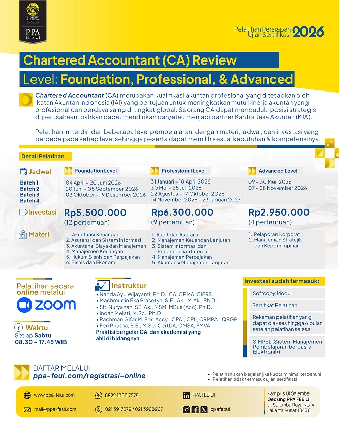 Sangat recommended jika ingin berlatih di CFA PPA FEB Ul karena para pengajar tidak hanya sebagai akademisi namun banyak merangkap sebagai praktisi yang ahli di bidangnya. Materi yang disampaikan sangat bermanfaat dan bisa diterapkan dalam melakukan analisa keuangan. Terima kasih